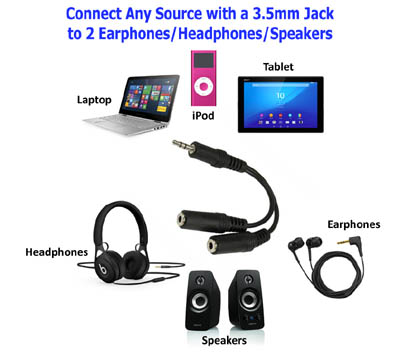 This headphone splitter allows you to connect 2 headphones or speakers to a single source so you can share your music, videos, and games with your friends and family. Perfect for keeping the kids entertained during road trips or when traveling. Allows for each person to have their own set of headphones/earphones, eliminating the hassle of having to share the same headset. This splitter works with any device that has a 3.5mm jack, such as laptops, tablets, smartphones, MP3 players, CD players, and portable DVD players..